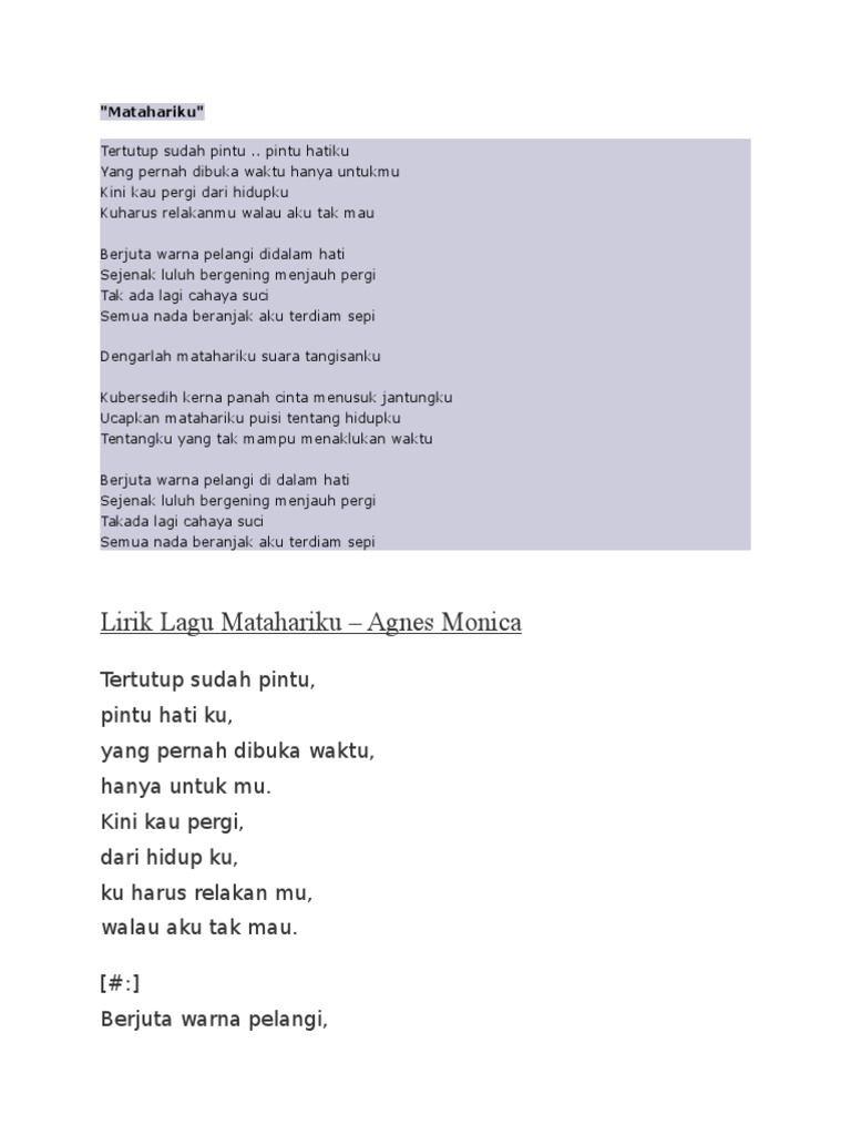 Matahariku Lyrics By Agnes Monica Tertutup Sudah Pintu Pintu